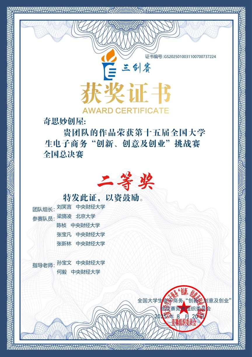 8月4日至6日,第十五届全国大学生电子商务“创新、创意及创业”挑战赛(简称“三创赛”)常规赛全国总决赛在贵阳举行。由我校中国互联网经济研究院孙宝文教授、何毅副研究员指导,437bwin必赢国际学子刘笑言担任队长,437bwin必赢国际陈桢、张新林、张宝凡为成员的团队“奇思妙创屋”荣获国家二等奖、北京市特等奖的殊荣,创下学校在“三创赛”领域的最佳成绩。