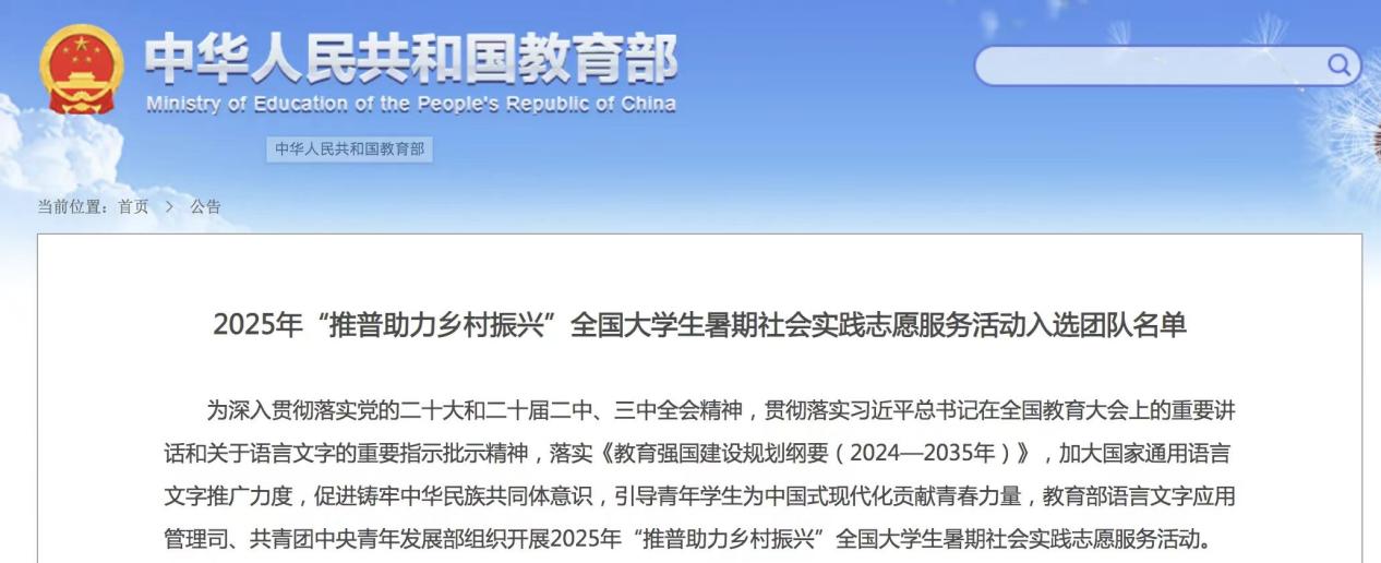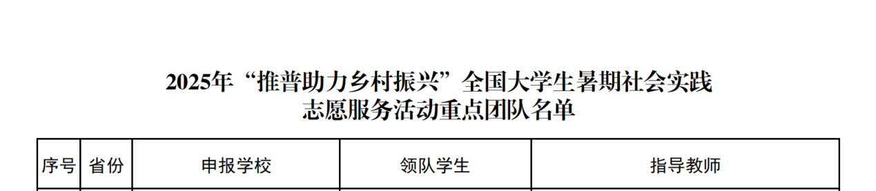 2025年7月4日,教育部公布了2025 年“推普助力乡村振兴”全国大学生暑期社会实践志愿服务活动入选团队名单。437bwin必赢国际1支团队入选重点团队,3名教师作为重点团队指导教师。